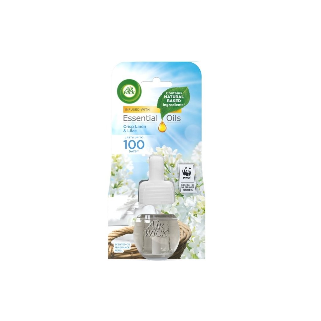 AIR WICK Essential Oils Crisp Linen & Lilac náhradná náplň 19ml Náhradná náplň do osviežovača vzduchu, ktorý vyplní každý interiér s krásnou arómou prírody. Obsahuje esenciálne oleje, ktoré ešte umocňujú sviežosť a intenzitu vône. Zloženie je založené na prírodných ingredienciách. Účinne eliminuje nepríjemný zápach a poskytuje dlhodobú vôňu. Preneste sa do prírody, kde budete cítiť sviežu vôňu orgovánu a čerstvej bielizne. Poskytuje o 30% väčšiu intenzitu vône. Špeciálne vybrané vône zabezpečujú dlhodobú sviežosť v každej miestnosti. Rozvoňajte si domov až na 100 dní pri nastavení nízkej intenzity. Objem balenia: 19mlDodatočné parametre