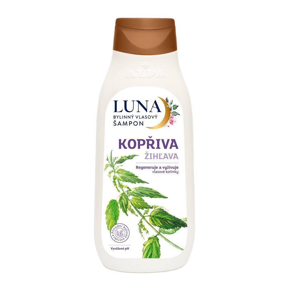 ALPA Luna Žihľava bylinný šampón na vlasy 430mlBylinný šampón na vlasy Luna Žihľava je určený pre poškodené vlasy.Obsahuje výťažok zo žihlavy, ktorý obsahuje vitamín C podporujúci regeneráciu a výživu vlasových korienkov.Tiež obsahuje kremík, ktorý posilňuje štruktúru vlasov a pozitívne pôsobí na vlasovú pokožku.Regeneruje vaše vlasy od korienkom ku končekom.Vytvára bohatú penu, ktorá dokonale odstraňuje všetky nečistoty z vašich vlasov i pokožky hlavy.Poskytuje vašej pokožke jemnosť, hebkosť a neodolateľný lesk.Udržuje vyvážené pH vašich vlasov.Zanecháva vaše vlasy dokonale jemné a hebké s príjemnou a sviežou vôňou žihľavy.Objem balenia: 430ml