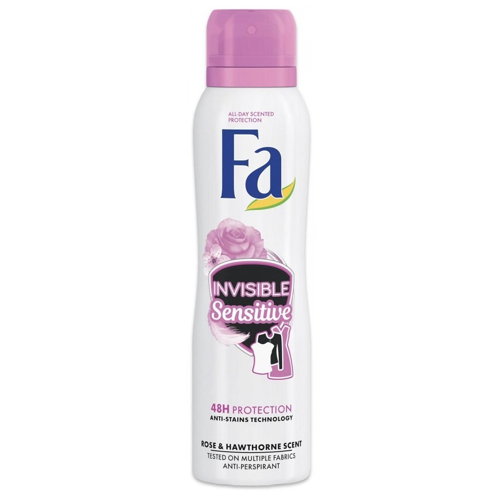FA Invisible Sensitive deospray 150ml Dámsky antiperspirant Invisible Sensitive poskytuje ochranu proti poteniu a eliminuje nepríjemný zápach až na 48 hodín. Obsahuje Anti - Stains technológiu, ktorá chráni vaše oblečenie pred vznikom škvŕn a stôp. Zloženie antiperspirantu je jemné a dokonale sa stará o pokožku podpazušia. Zanecháva vašu pokožku pokožku sviežu s príjemnou vôňou kvetinovú vôňu ruže. Neobsahuje alkohol a nedráždi pokožku. Objem balenia: 150ml, UPOZORNENIA A NEBEZPEČENSTVÁ NEBEZPEČENSTVO:Horľavina Nádoba je pod stálim tlakom, Nevhadzujte do otvoreného ohňa.Dodatočné parametre