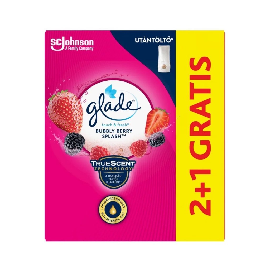 GLADE Touch Fresh Bubbly Berry Splash náhradná náplň 3x10ml Náhradná náplň do osviežovača vzduchu, ktorá dokonale eliminuje nepríjemné zápachy. Obsahuje technológiu TrueScent, vďaka ktorej udržuje dlhodobú sviežosť vône. Preneste sa do lesa, kde budete cítiť vôňu jahôd a čučoriediek. Svieža vôňa vyplní Váš dom či byt a vytvorí príjemnú atmosféru. Použitie: Vložte náplň do držiaka, až budete počuť cvaknutie. Zatvorte kryt a pre uvoľnenie vône stlačte jeho prostrednú časť. Objem balenia: 3x10mlDodatočné parametre