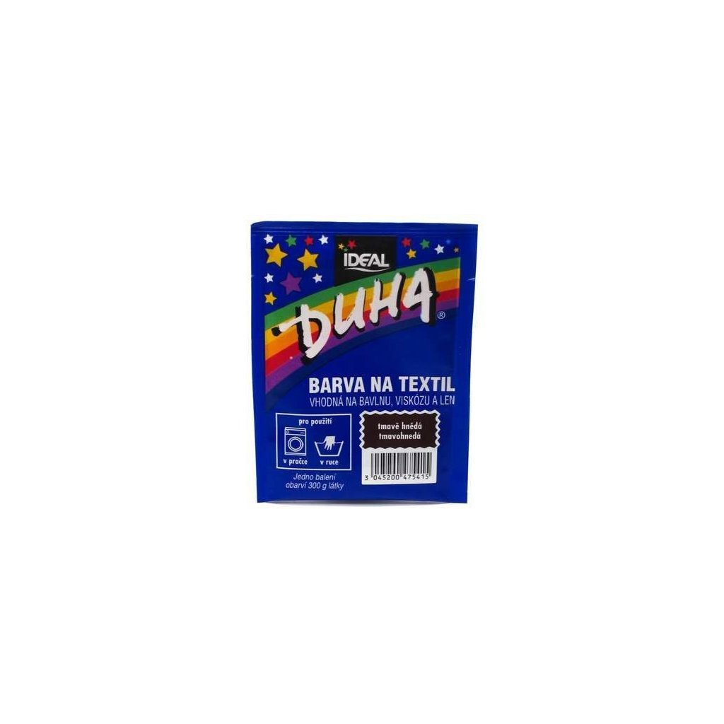IDEAL DUHA farba na textil tmavohnedá 15g Tmavohnedá farba vhodná na bavlnu, viskózu a ľan. Jedno balenie ofarbí 300 g látky. Ručná farbenie: Obsah sáčku rozpusťte v 1/4 l horúcej vody. Roztok nalejte do nádoby so 7 – 10 litrami vlažnej vody a pridajte 10 polievkových lyžíc kuchynskej soli (200 g). Ponorte farbenú látku do roztoku, rovnomerne rozprestrite a za občasného miešanie priveďte do varu. Udržiavajte takto pri miernom vare 20 minút, potom odstavte a občas zamiešajte, až voda takmer vychladne. Farbenú látku potom plákajte v studenej vode, pokiaľ nie je voda číra. Objem balenia: 15gDodatočné parametre