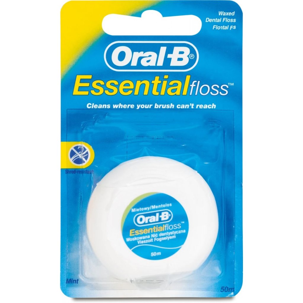 ORAL-B Essential Floss zubná niť 50m Zubná niť Essential Floss je určená na dôkladné čistenie zubov a zubných medzier, kam sa zubná kefka nedostane. Obsahuje špeciálne vyvinuté vlákno s polymérovým poťahom, ktoré odstraňuje zubný povlak bez námahy. Štruktúra zubnej nite je vysoko odolná proti štiepeniu a ľahko sa s ňou dostanete do medzizubných priestorov a pod okraje ďasien. Ľahko sa vsúva a pri zasunutí medzi zuby sa nerozstrapká, ani neroztrhne. Odstraňuje baktérie zubného povlaku a všetky nečistoty v medzizubných priestoroch a pod okrajom ďasien. Zanecháva Vaše zuby dôkladne vyčistené s príjemnou mätovou príchuťou. Balenie obsahuje: 50mDodatočné parametre