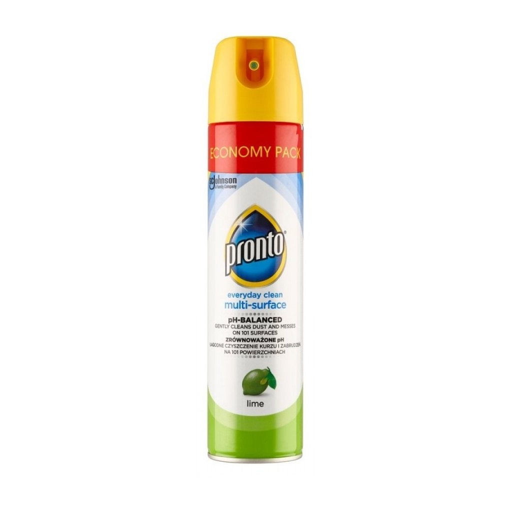 PRONTO Everyday Clean Multi-Surface Lime prípravok proti prachu 300ml Prípravok proti prachu Everyday Clean Multi-Surface Lime je určený pre všetky povrchy v domácnosti. Obsahuje špeciálnu formulu, vďaka ktorej ošetruje povrch a zabraňuje opätovnému usadzovaniu prachu. Dokonale odstraňuje prach, mastnotu, škvrny a šmuhy. Zanecháva Váš nábytok dokonale čistý bez akýchkoľvek nečistôt a prachu s príjemnou vôňou levandule. Udržuje prirodzené Ph všetkých povrchov. Zanecháva čistený povrch dokonale čistý s príjemnou vôňou limetky. Objem balenia: 300mlDodatočné parametre