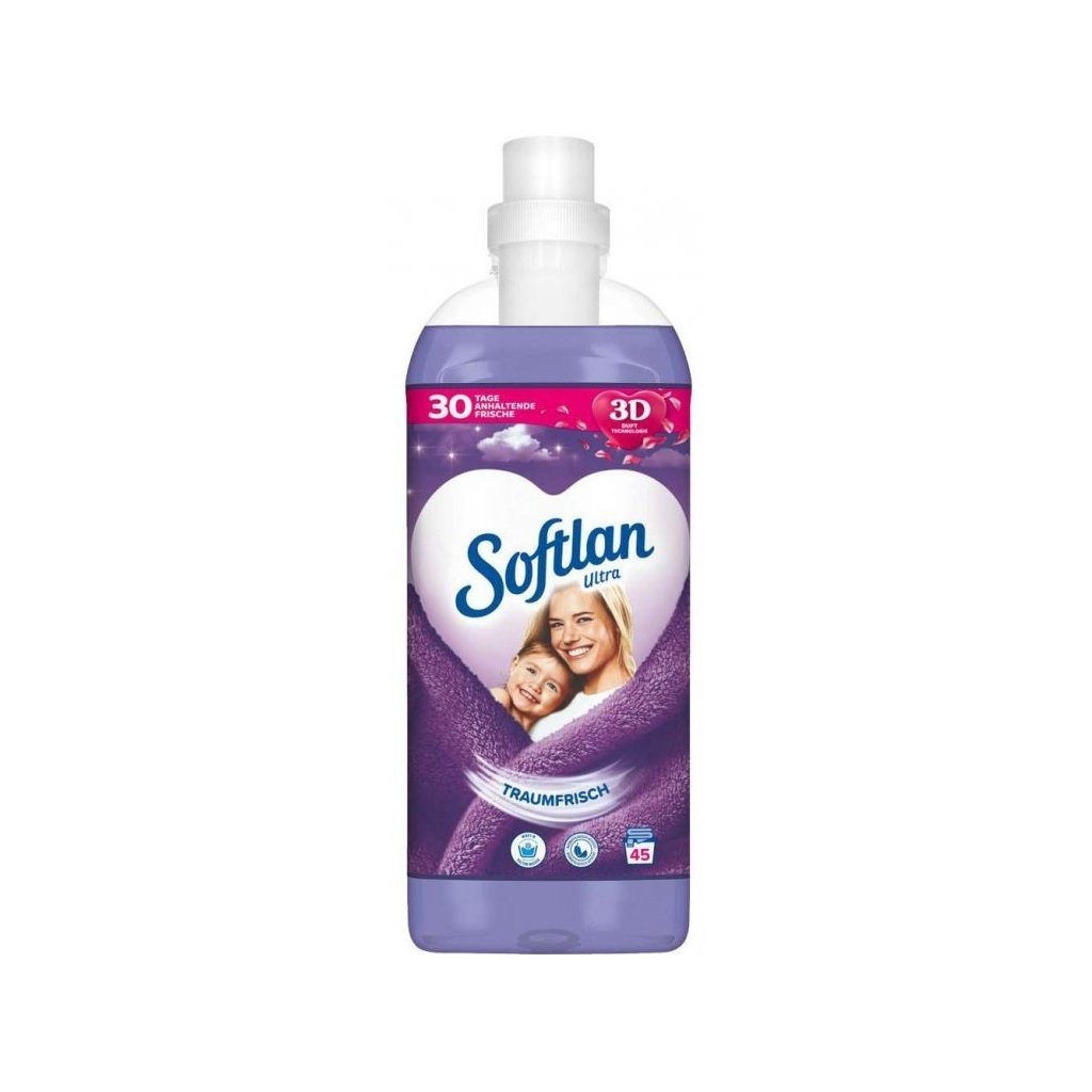 SOFTLAN Ultra Traumfrisch aviváž 45 praní 1L Aviváž Ultra Traumfrisch je určený pre citlivú a detskú pokožku. Obsahuje 3D technológiu, vďaka ktorej sa postupne uvoľňujú vonné perličky a poskytujú dlhodobú sviežosť. Aviváž je šetrná ku tkaninám, zmenšuje sa krčivosť látok a tým uľahčuje žehlenie. Zjemňuje a zmäkčuje vaše oblečenie. Chráni štruktúru oblečenia pred roztiahnutím a zdeformovaním. Chráni vaše oblečenie pred statickou elektrinou. Zanecháva príjemnú sviežu vôňu, ktorá vydrží až 30 dní. Objem balenia: 45 praní = 1LDodatočné parametre